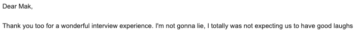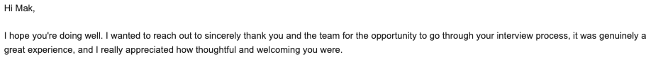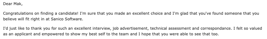 If you’re someone who applied for this role and this happened to you. I apologise for that. I dearly hope you found a role that aligns with your values, and the type of culture you’d like to be a part of. You choose the company you want to work for too.