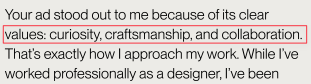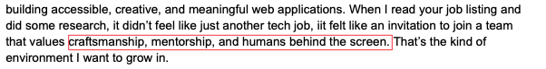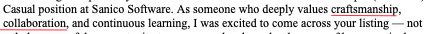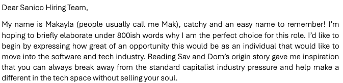 To my surprise the Sanico ad popped up again and I gave it another read. I backspaced my whole cover letter and started from scratch. I wasn’t even mad though. I thought it was a breath of fresh air to have the opportunity to write something personal without saying, “I align myself with the values of the company.” Thanks Dom and Sav for letting me cook in my cover letter.