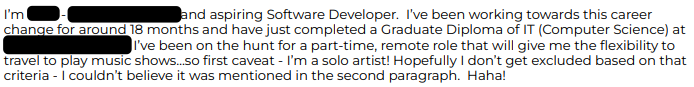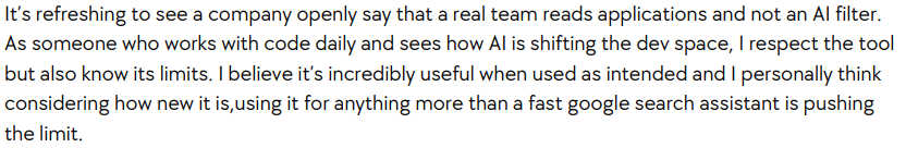 That team member mentioned, is both myself and Sav. Endless scrolling to gauge if there’s a robotic undertone to candidates letters. We place a significant emphasis on the cover letter and not the resume for a few reasons. Our main point is we believe it is very hard to fake a well written cover letter. As good as AI is for a handful of tasks, the one thing it can’t do is give the personalisation that can only be done by humans. Sure, it could study your prompts and attempt to apply it’s creative flare. But we know well enough what true personalisation looks like.